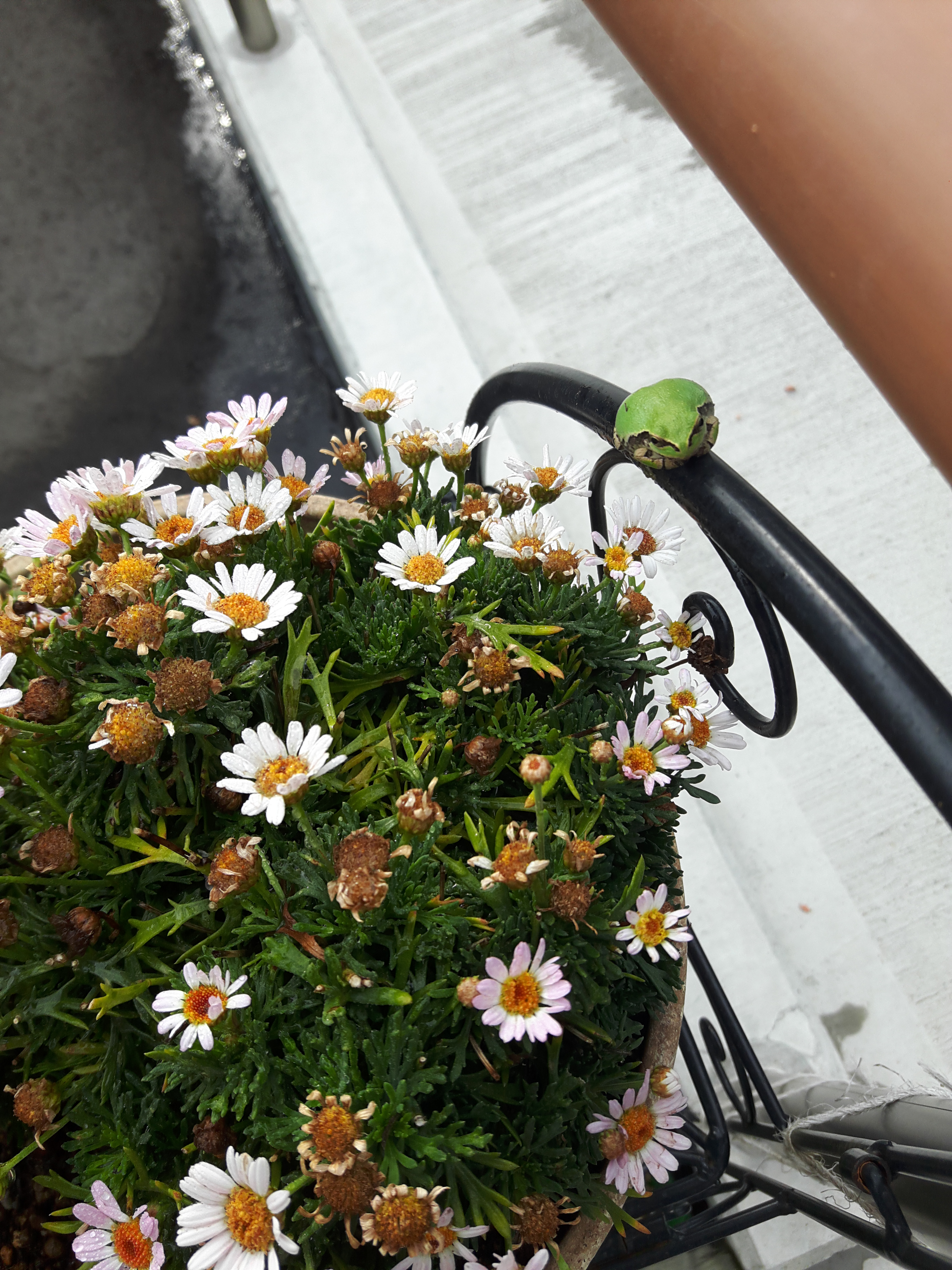 カエルにも 自分の住む所が 決まっているのか? いっぱい 花があるのに いつも この花の所にいるんです🏡